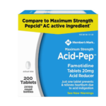 Compare to Maximum Strength Pepcid AC active ingredient. Just one tablet of Member’s Mark™ Acid-Pep Famotidine Tablets, 20 mg prevents and relieves heartburn associated with acid indigestion brought on by eating and drinking certain foods and beverages. This maximum strength heartburn medicine is intended for adults and children 12 years and over. Helps prevent meal-induced heartburn when taken at least 10-60 minutes before eating. Lasts up to 12 hours.