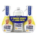Better than traditional cleaning sprays, Mr. Clean, Clean Freak Mist multi-surface cleaning spray muscles through grime, tough dirt, and grease to make tough messes a distant memory. Use it in the kitchen, bathroom and all other rooms in your home to get hard-to-reach dirt gone for good. Clean Freak works great on large kitchen surfaces, backsplashes, shower tiles, tubs, glass stovetops, stainless steel, and more due to the Power Nozzle, which provides continuous bursts of cleaner mist. And to top it all off, Mr. Clean, Clean Freak Mist multi-purpose cleaning spray leaves your home smelling fresh with a refreshing Lemon Zest scent. Included in this pack are two 16oz Mr. Clean, Clean Freak trigger sprays to conveniently store in your bathroom and kitchen to quickly handle any mess around the home. Also included is a 30.9oz large refill bottle with an easy-pour cap that allows you to refill the Clean Freak trigger sprays. To refill, simply twist the sprayer top to the left to loosen and remove, pour in liquid until full, and affix the top by twisting to the right. Now you are ready to tackle tough messes once again with Mr. Clean, Clean Freak Mist multi-surface cleaning spray!