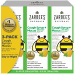 Using natural ingredients and natural grape flavor, Zarbee’s cough syrups contain no alcohol, drugs, artificial sweeteners, artificial flavors or dyes. They are also gluten-free. Zarbee’s Cough Syrup + Mucus products are made with a proprietary blend of natural dark honey for coating and soothing the throat and English ivy leaf extract to help to clear mucus.